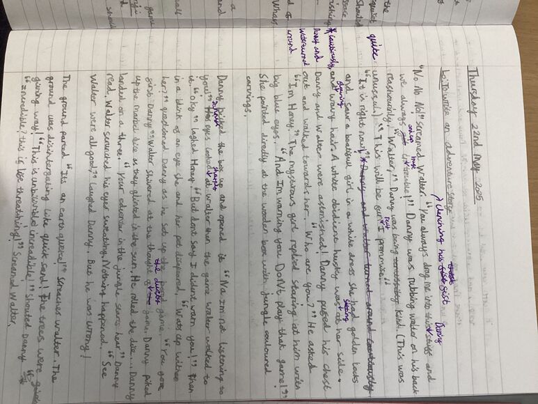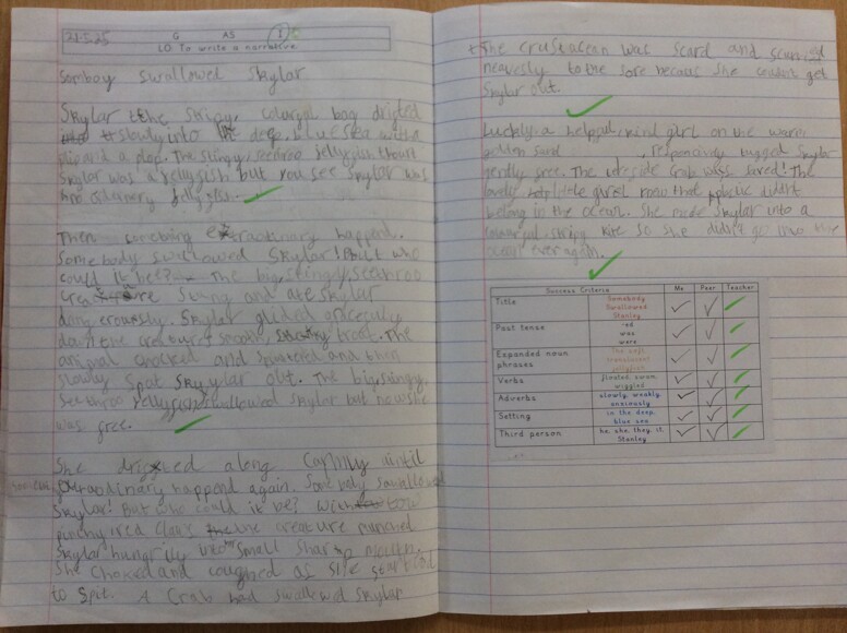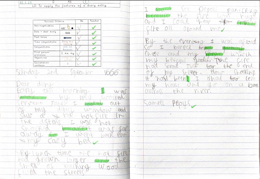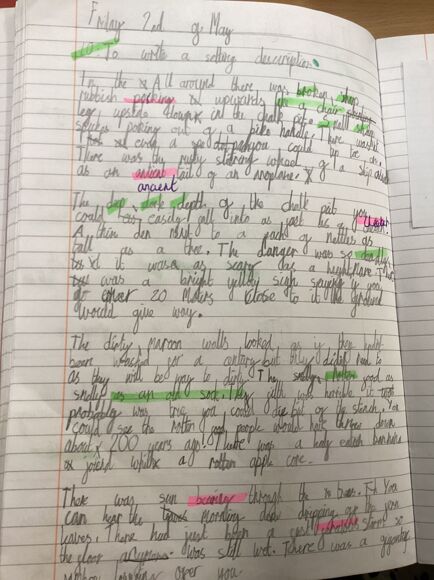 A secure knowledge of spelling, grammar and punctuation are taught to ensure that the children understand their writing on a structural level and how to use this to create more effective writing. The children are encouraged to edit throughout and after writing and are taught view writing as a process that requires persistence. As children progress through the school they are encouraged, with increasing independence, to identify the improvements and corrections needed in their writing.